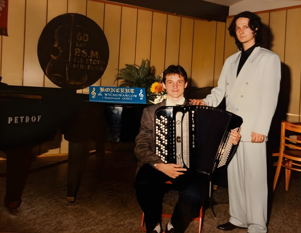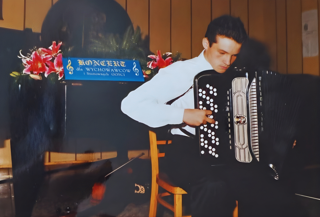 Moim pierwszym nauczycielem był mgr Jarosław Jeżewski, którego wspominam z ogromnym sentymentem. To on nauczył mnie fundamentów gry, zaraził pasją do akordeonu i zabierał na pierwsze konkursy – m.in. do Raciborza i Mławy. Już wtedy pojawiały się pierwsze drobne sukcesy, a ja coraz głębiej zakochiwałem się w muzyce akordeonowej.