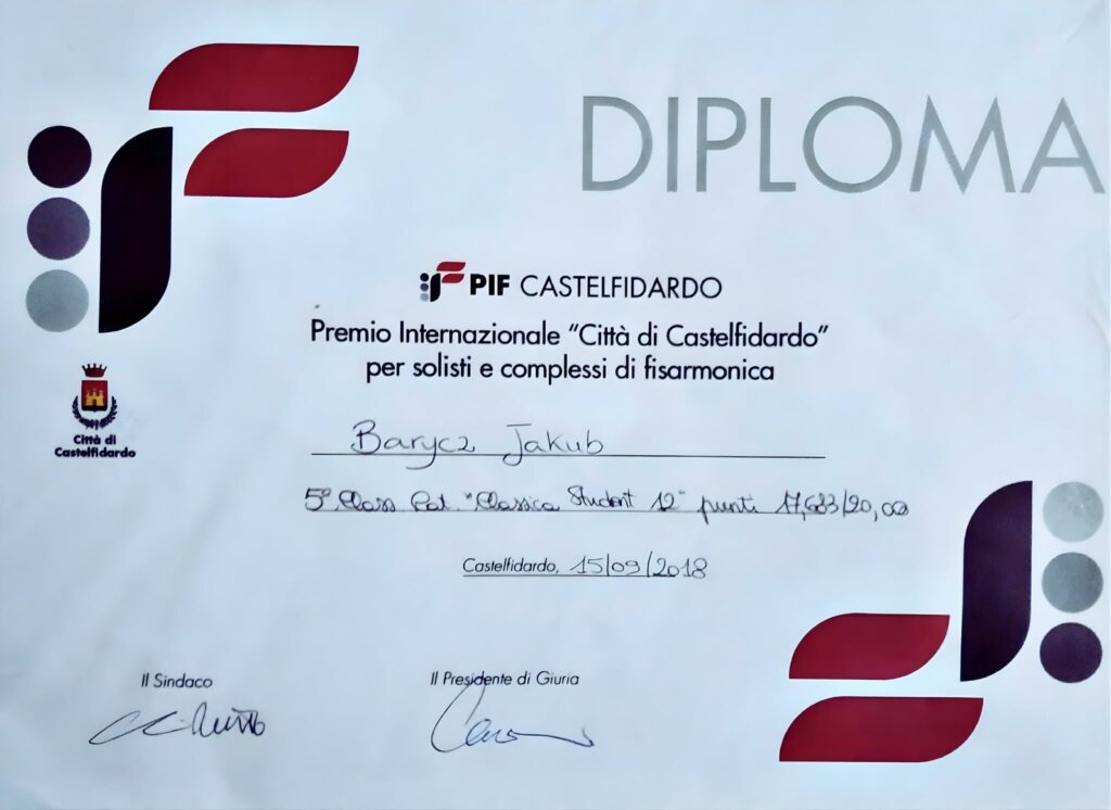 Szczególne miejsce w moim sercu mają dwaj uczeniowie: Jakub Barycz (mój absolwent szkoły średniej w Bystrzycy Kłodzkiej), który zdobył V miejsce w Międzynarodowym Konkursie Akordeonowym w Castelfidardo oraz Kamil Urbański (mój absolwent I st. w Kłodzku), który zajął VI miejsce – jednym z najważniejszych konkursów akordeonowych na świecie. Był to sukces spektakularny, choć – przyznam szczerze – nie do końca należycie zauważony w ich rodzinnych regioniach. Pozostawię to jednak bez komentarza… Najważniejsze, że talent, praca i determinacja uczniów przyniosły im ogromny międzynarodowy sukces.