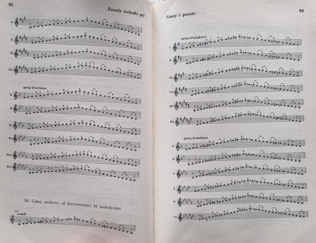 Autor opisuje także grę melodyczną na samych basach, przedstawiając przykładowe palcowania, m.in. dla gam. Temat ten został ujęty dość szeroko, a czytelnik może znaleźć tu kilka ciekawych rozwiązań i praktycznych wskazówek dotyczących techniki lewej ręki.