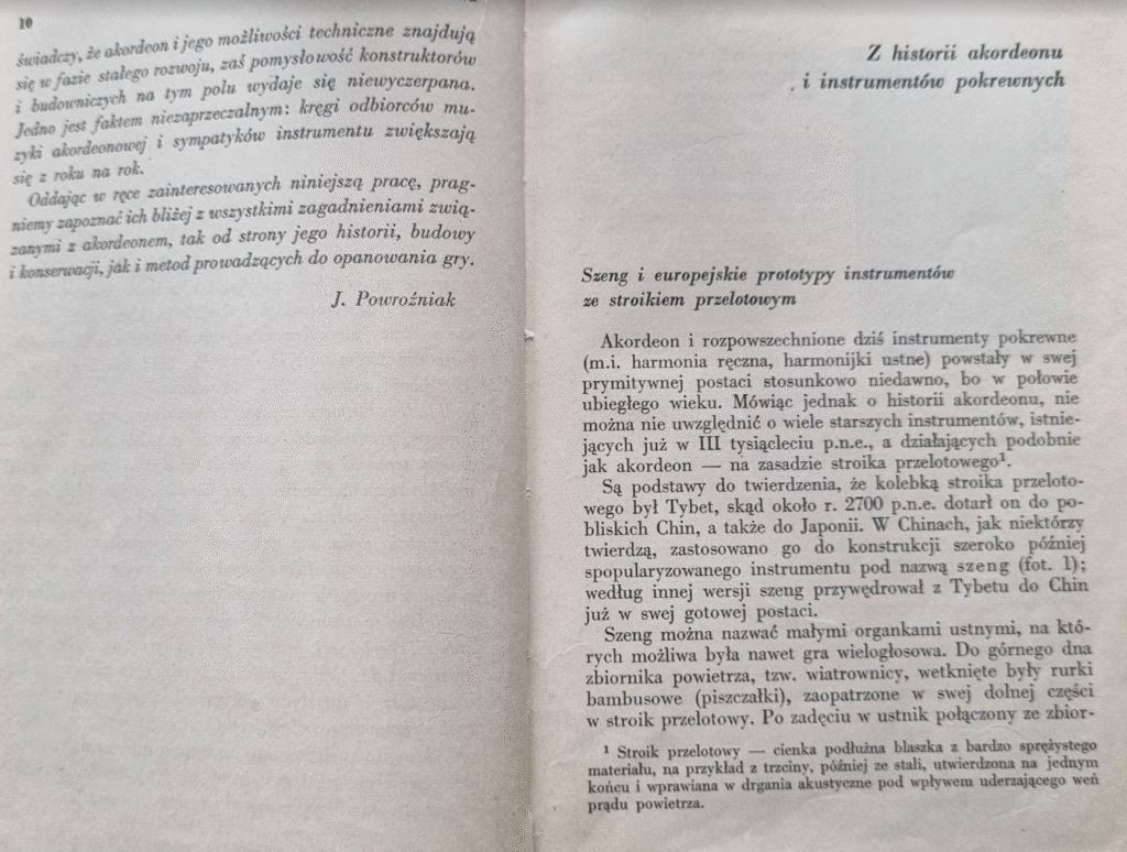 W zasadzie można uznać, że ta część książki pozostaje do dziś najbardziej wartościowa merytorycznie – to fragment, który najlepiej zniósł próbę czasu. Zgodnie z tradycją, historia akordeonu rozpoczyna się tu od opisu chińskiego instrumentu szeng. Opinie na temat jego roli jako „praojca akordeonu” są jednak podzielone. Z jednej strony atrakcyjna jest wizja sięgająca aż pięciu tysięcy lat wstecz, z drugiej – wielu badaczy uważa, że wiązanie współczesnego akordeonu wyłącznie z prymitywnym stroikiem przelotowym jest pewnym uproszczeniem i że korzeni instrumentu należy szukać gdzieś indziej.