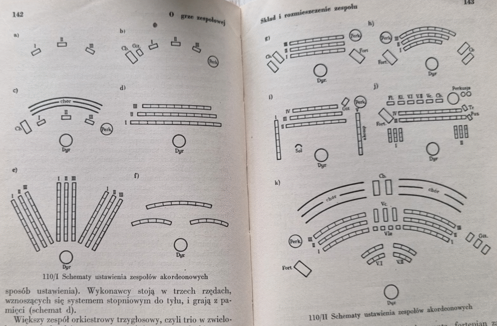 W podrozdziale zatytułowanym „Skład zespołu i rozmieszczenie wykonawców” Dastych przedstawia wiele praktycznych wskazówek dla osób prowadzących zespoły akordeonowe. To swoisty zestaw podstawowej wiedzy organizacyjnej, uzupełniony jednak o kilka dość oczywistych uwag, takich jak stwierdzenie, że „przy rozmieszczeniu wykonawców na estradzie należy brać pod uwagę jej wielkość”.