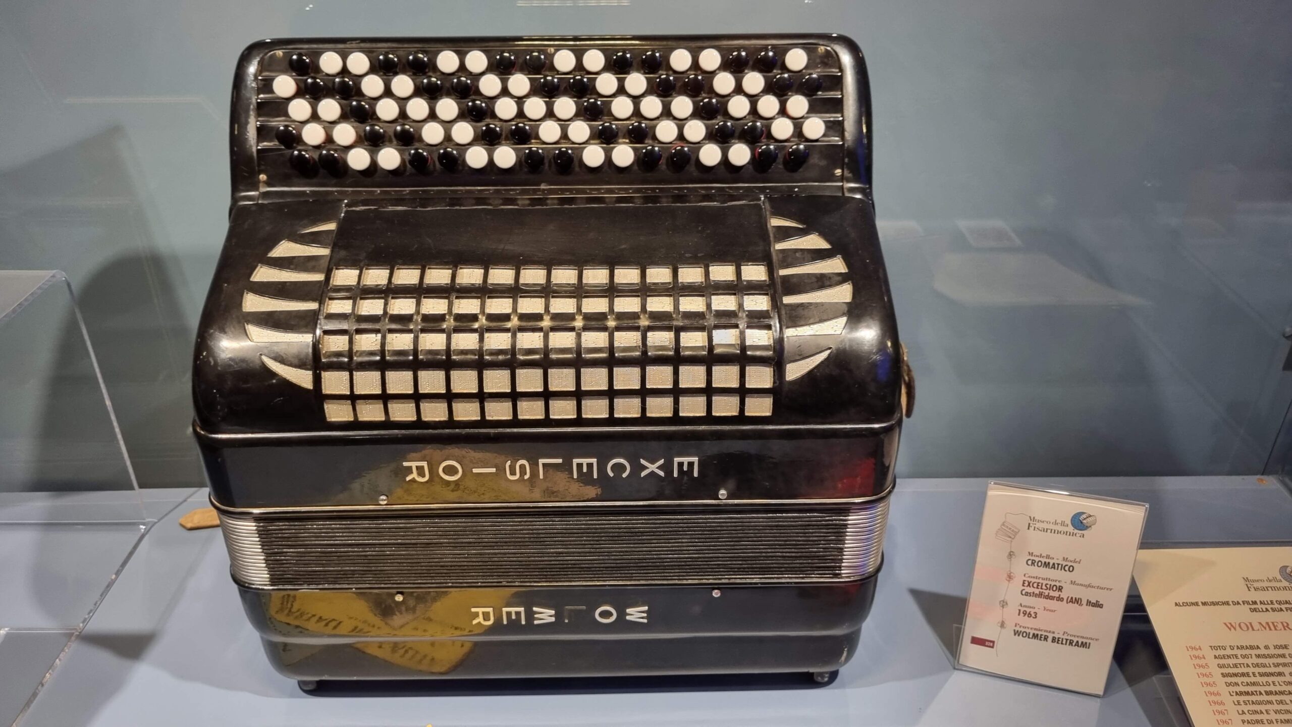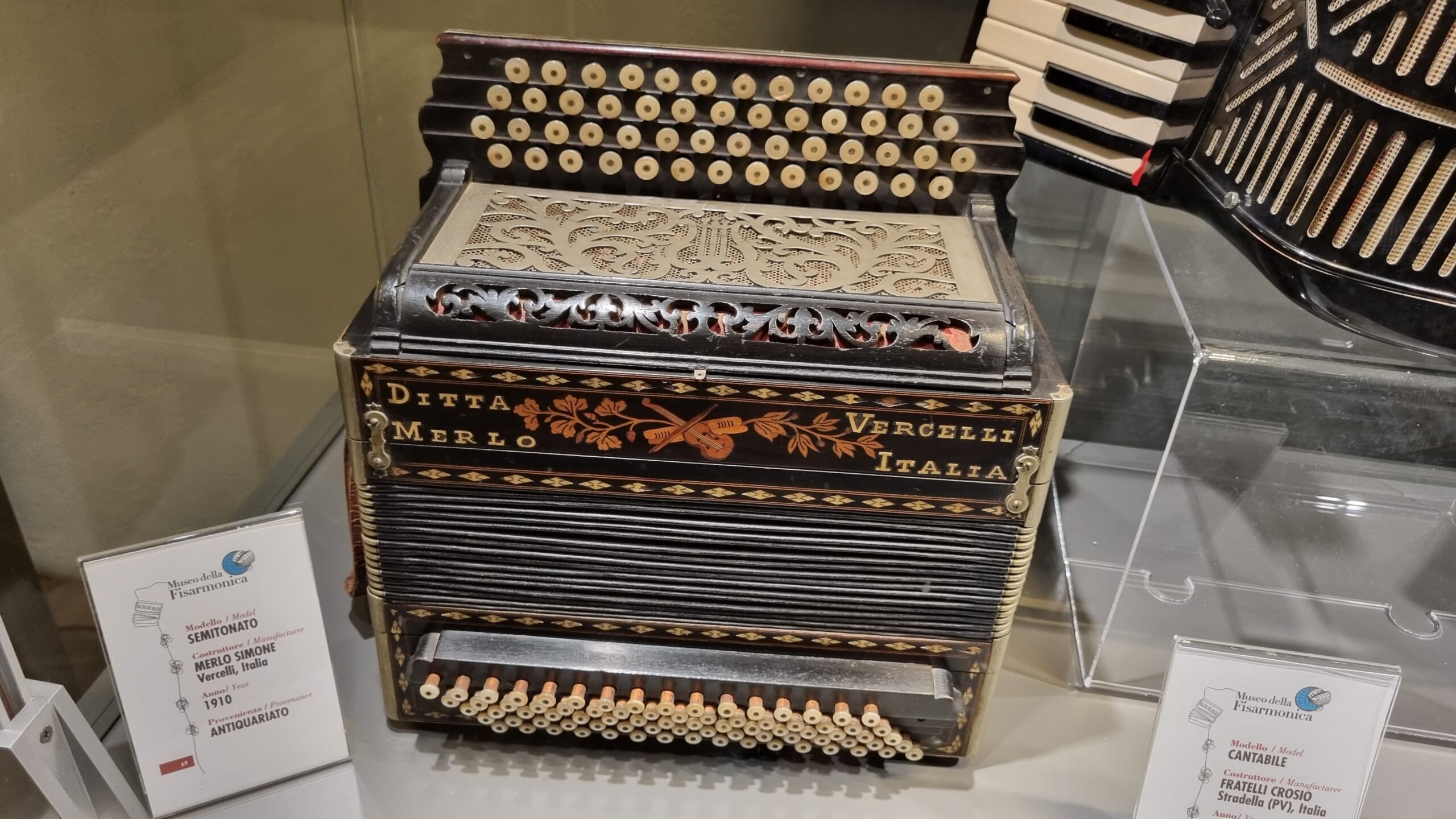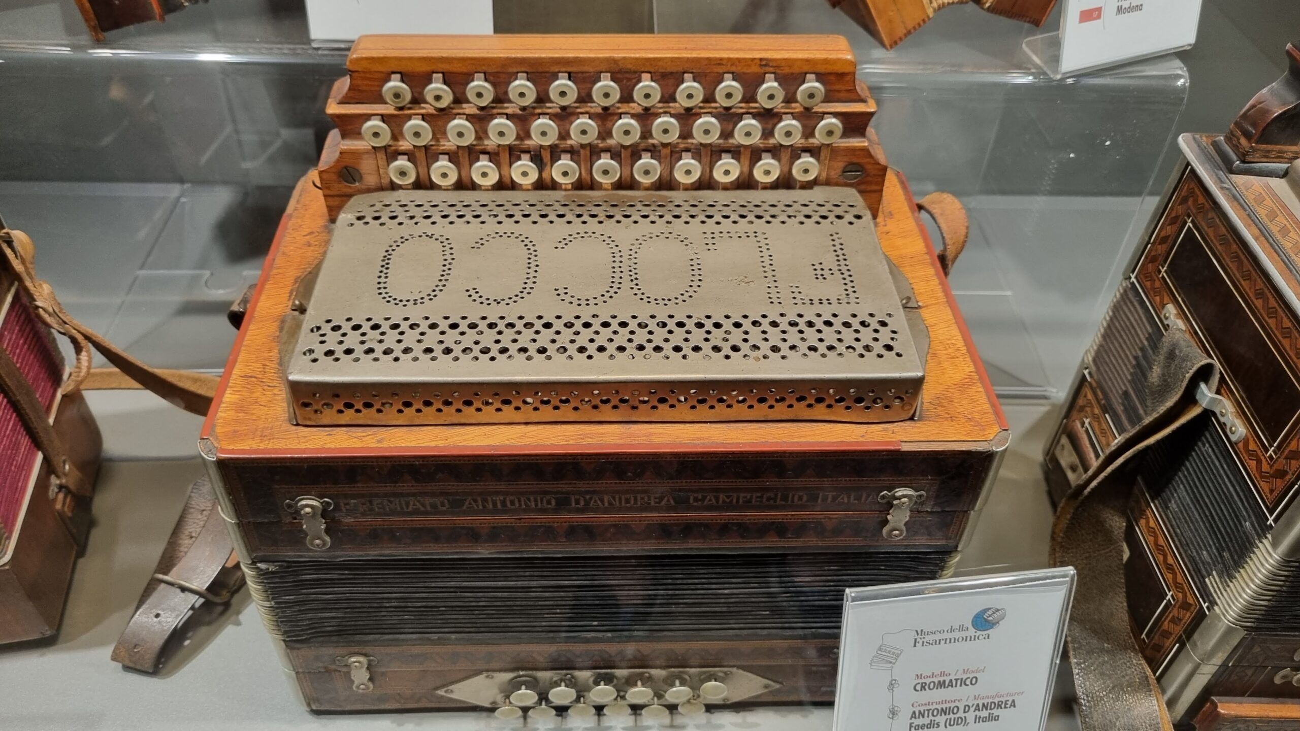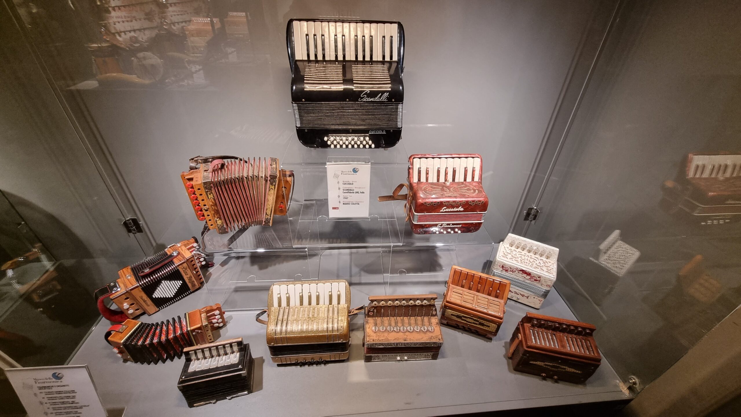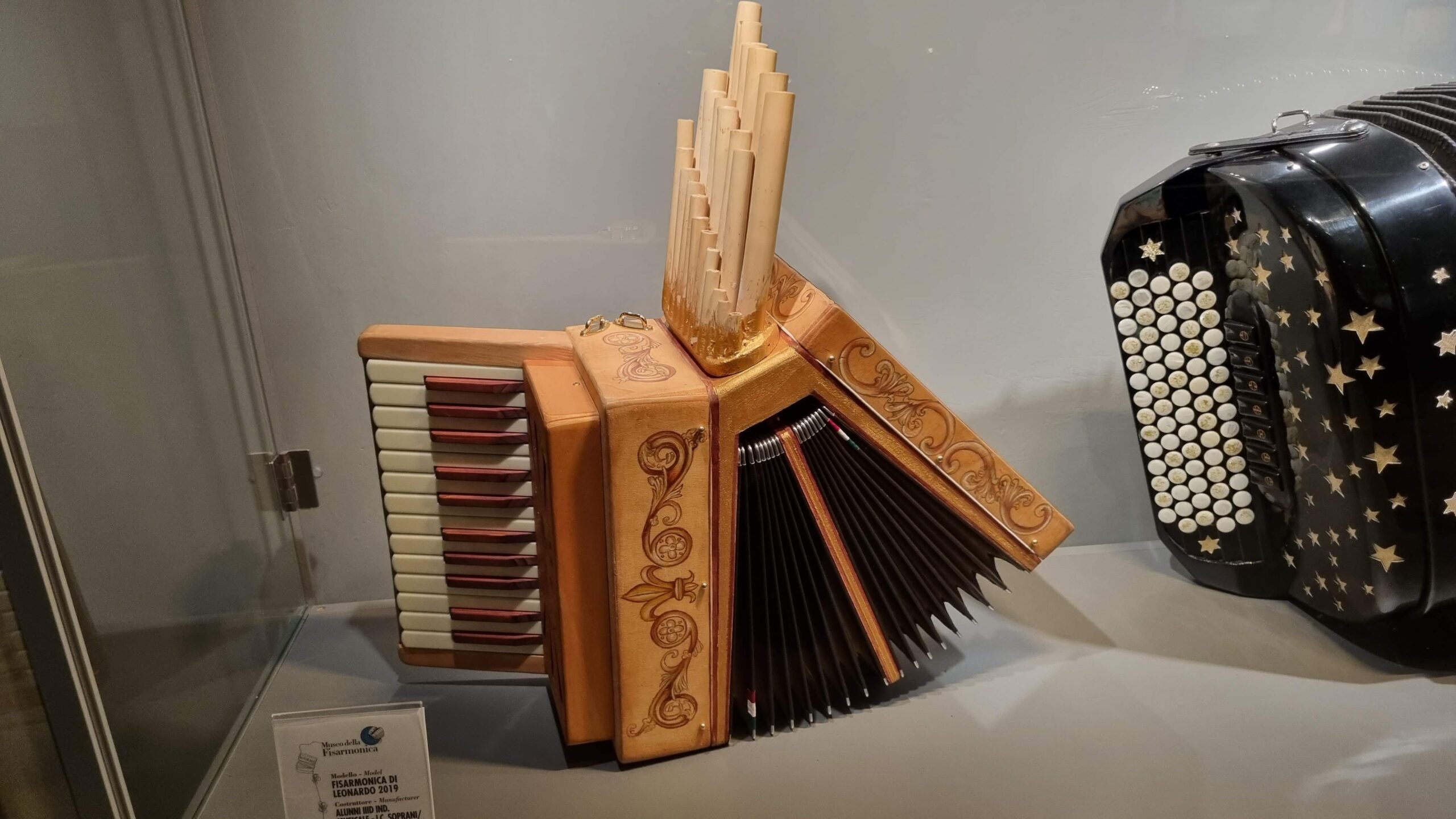 Nie brakuje też eksponatów wyjątkowych ze względu na konstrukcję – m.in. prototyp wykonany przez lutnika Mario Buonoconte na podstawie rysunku z Kodeksu Madryckiego II przypisywanego Leonardo da Vinci, czy akordeony Fisorchestra Frontalini, zaprojektowane tak, by imitować brzmienie orkiestry. W kolekcji znajdziemy również instrumenty używane w filmach, transparentny model firmy Brandoni wykonany z drewna i pleksi, odsłaniający mechanizmy wewnętrzne, a także egzemplarze z ogromnej kolekcji „króla naklejek” Giuseppe Paniniego.