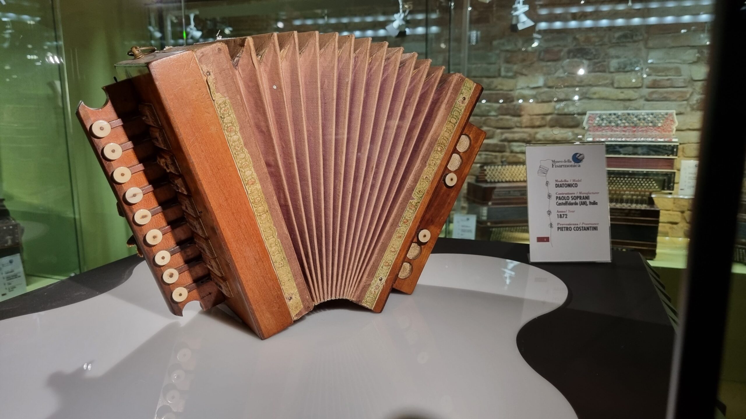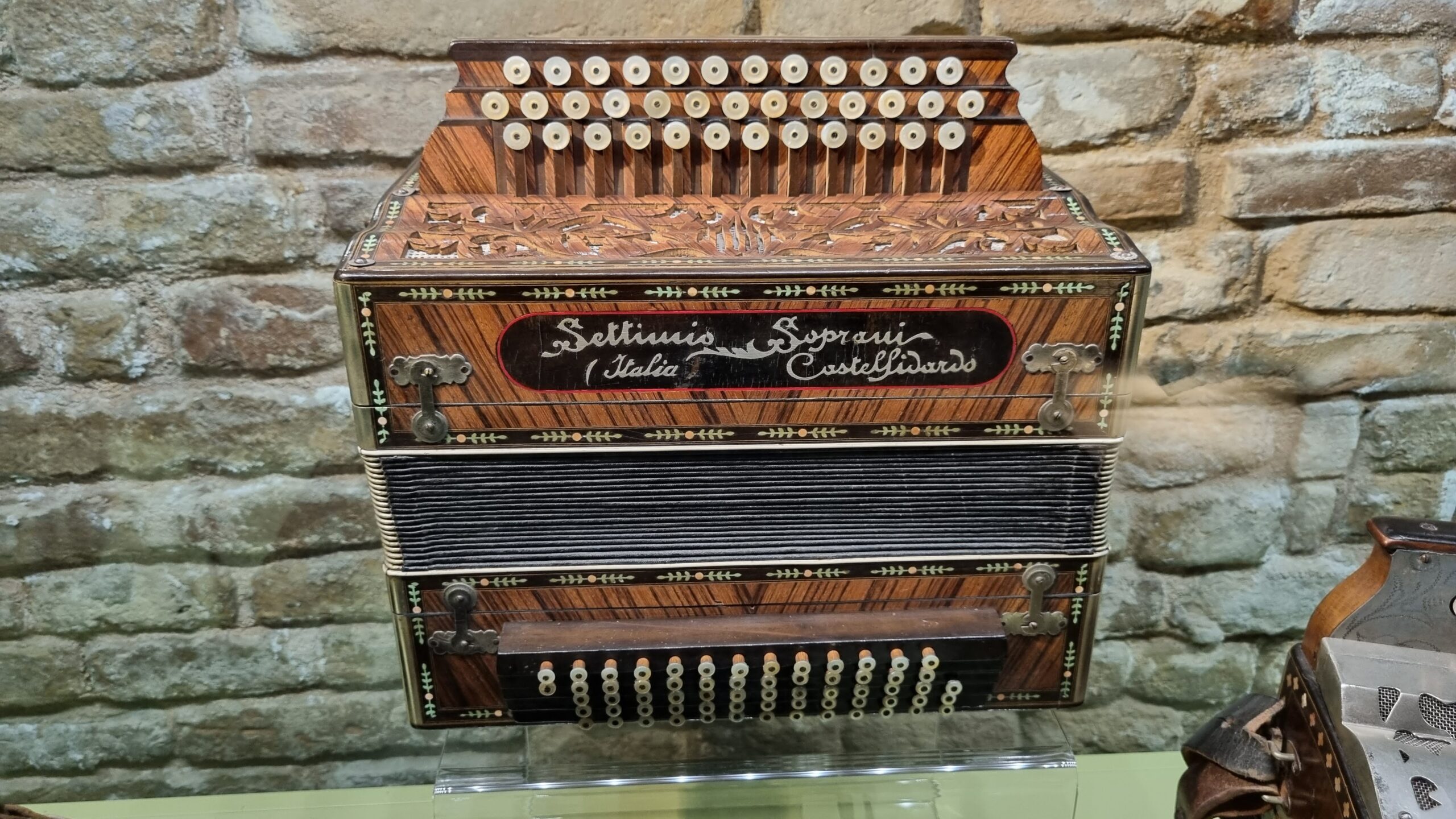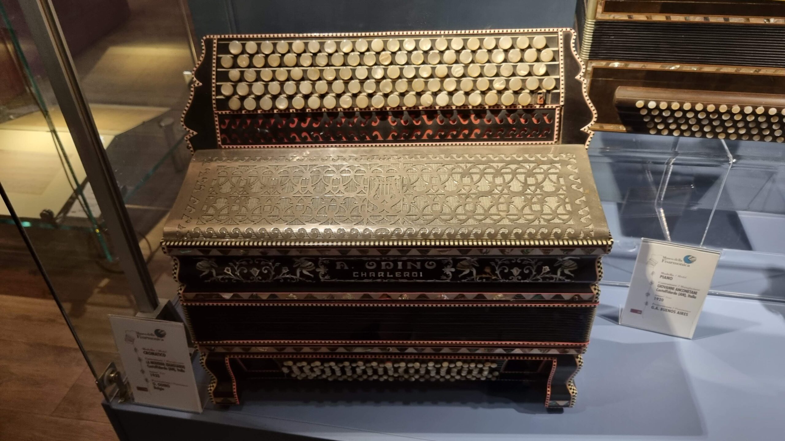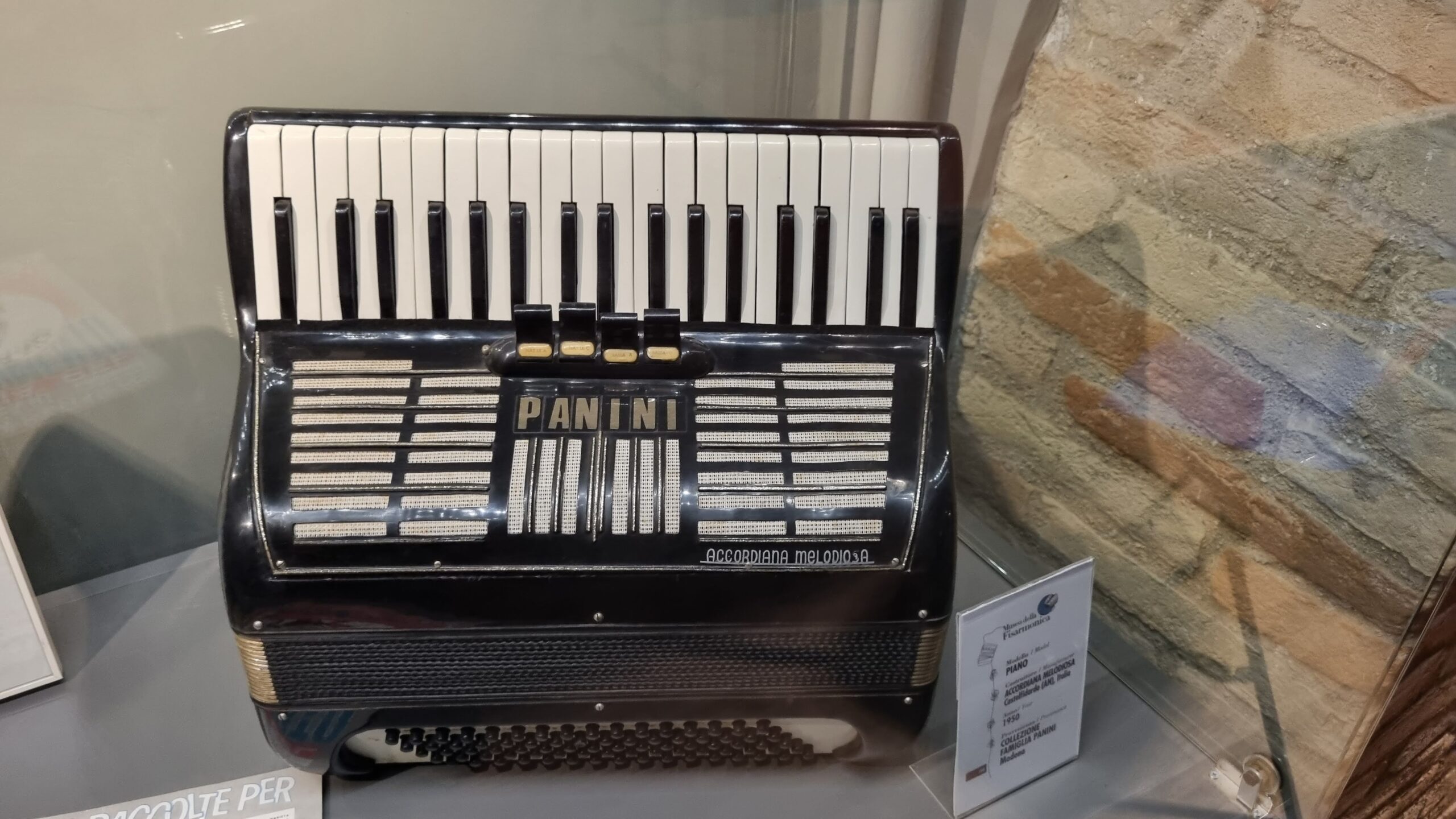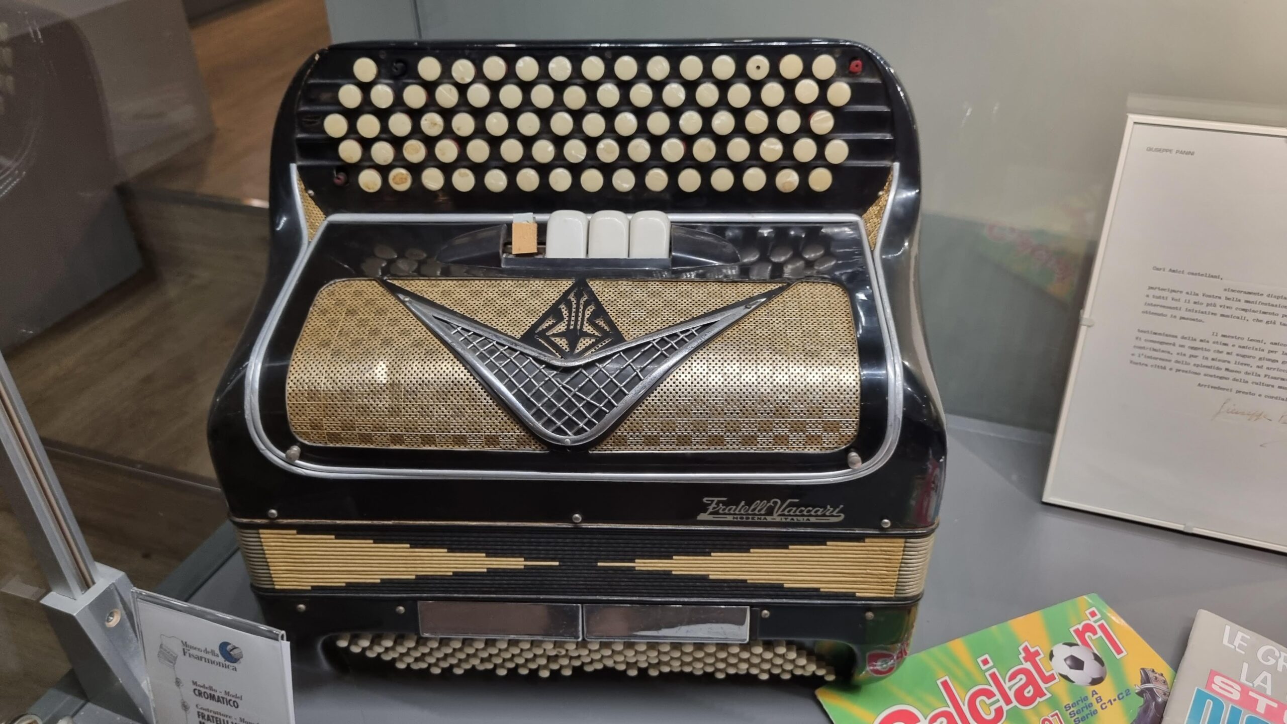 Nie brakuje też eksponatów wyjątkowych ze względu na konstrukcję – m.in. prototyp wykonany przez lutnika Mario Buonoconte na podstawie rysunku z Kodeksu Madryckiego II przypisywanego Leonardo da Vinci, czy akordeony Fisorchestra Frontalini, zaprojektowane tak, by imitować brzmienie orkiestry. W kolekcji znajdziemy również instrumenty używane w filmach, transparentny model firmy Brandoni wykonany z drewna i pleksi, odsłaniający mechanizmy wewnętrzne, a także egzemplarze z ogromnej kolekcji „króla naklejek” Giuseppe Paniniego.