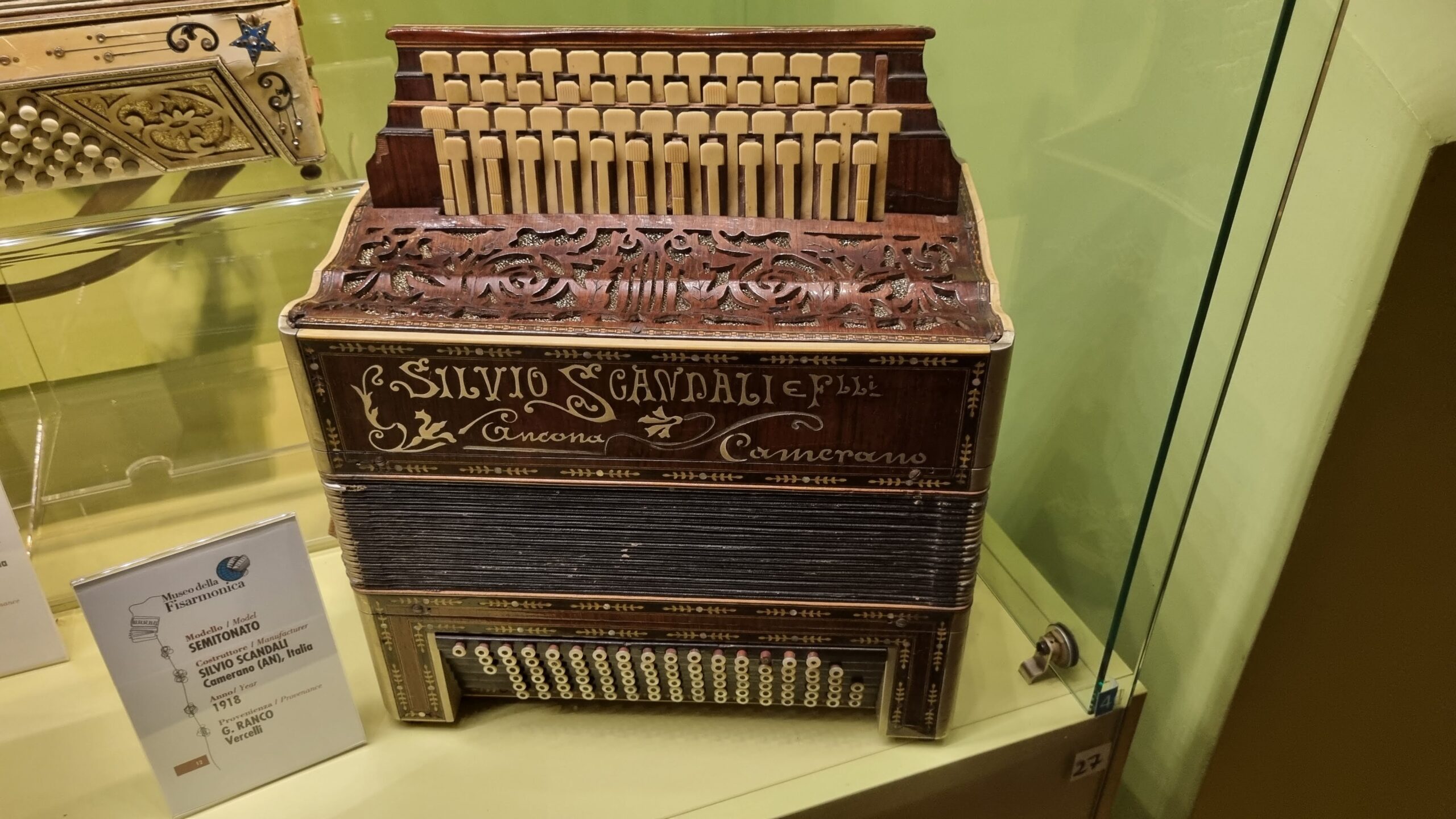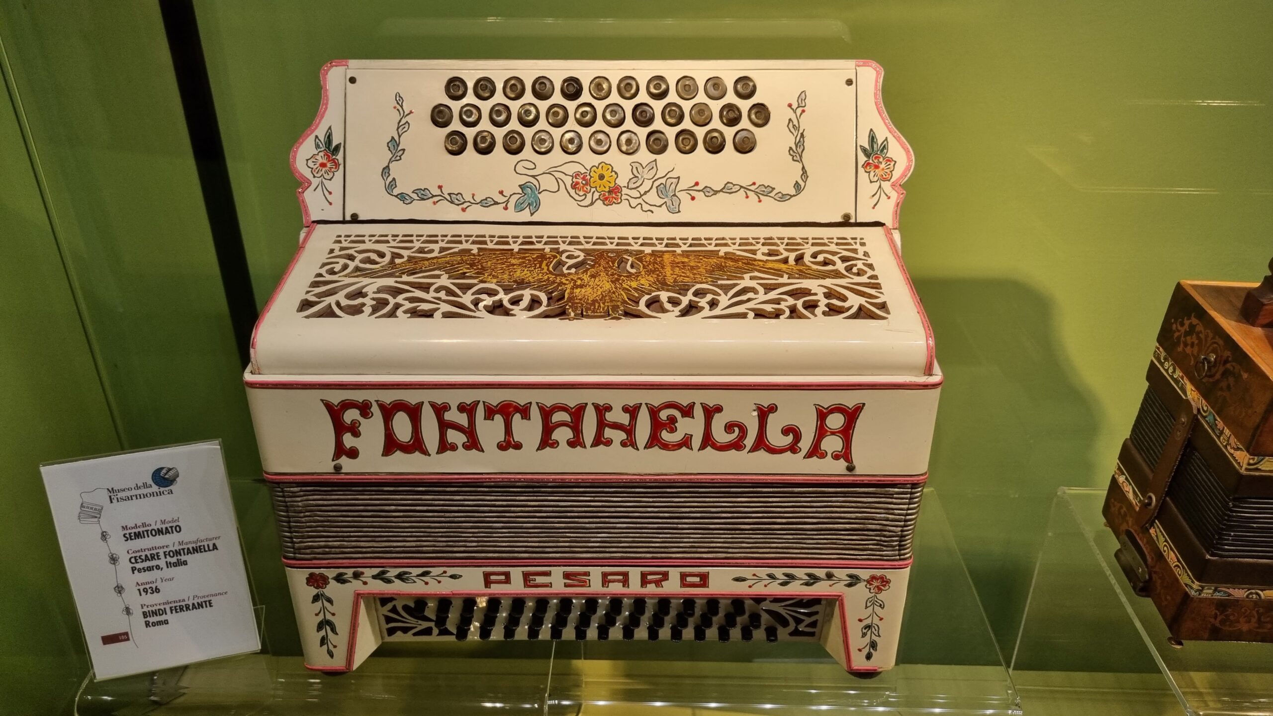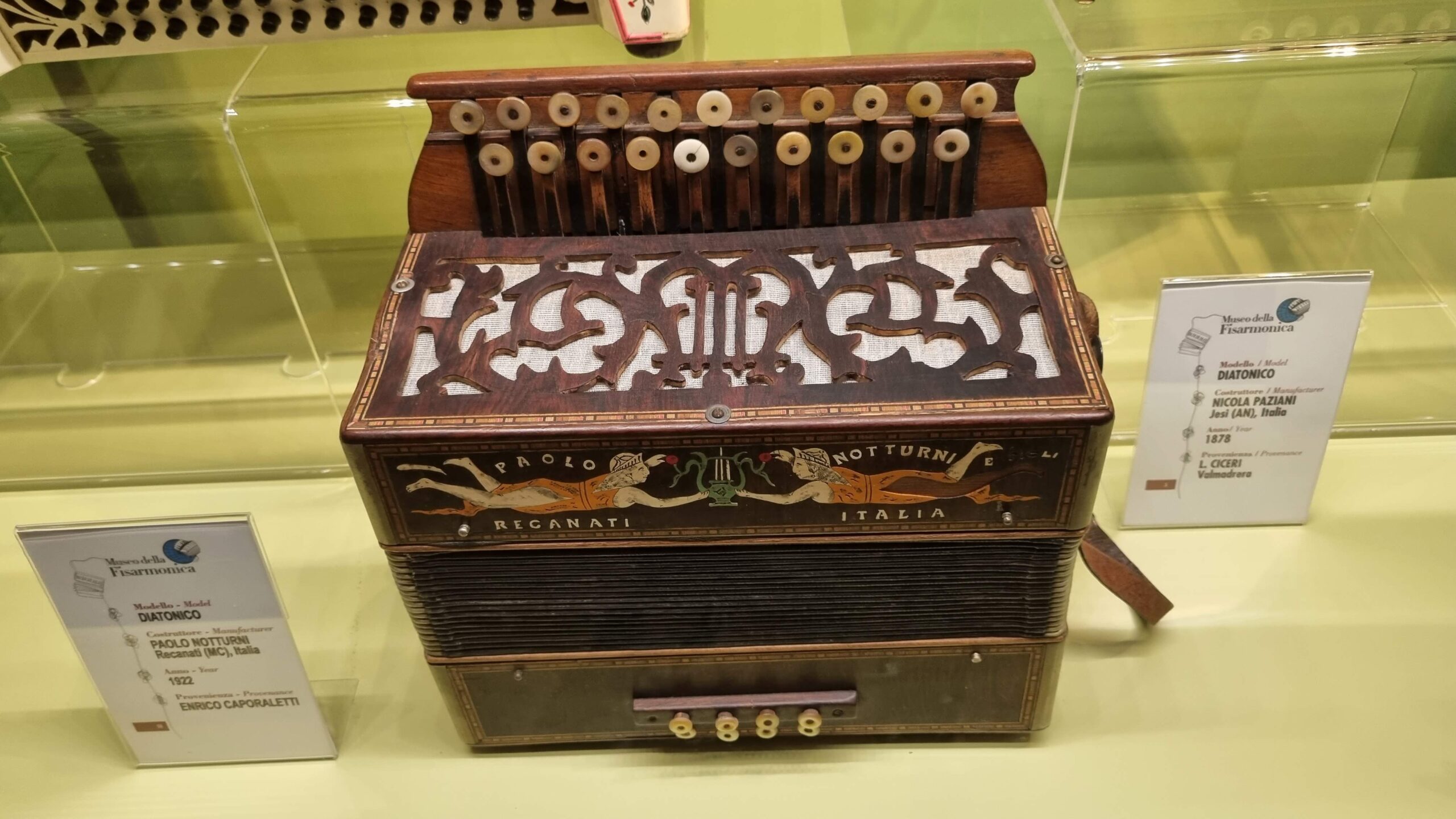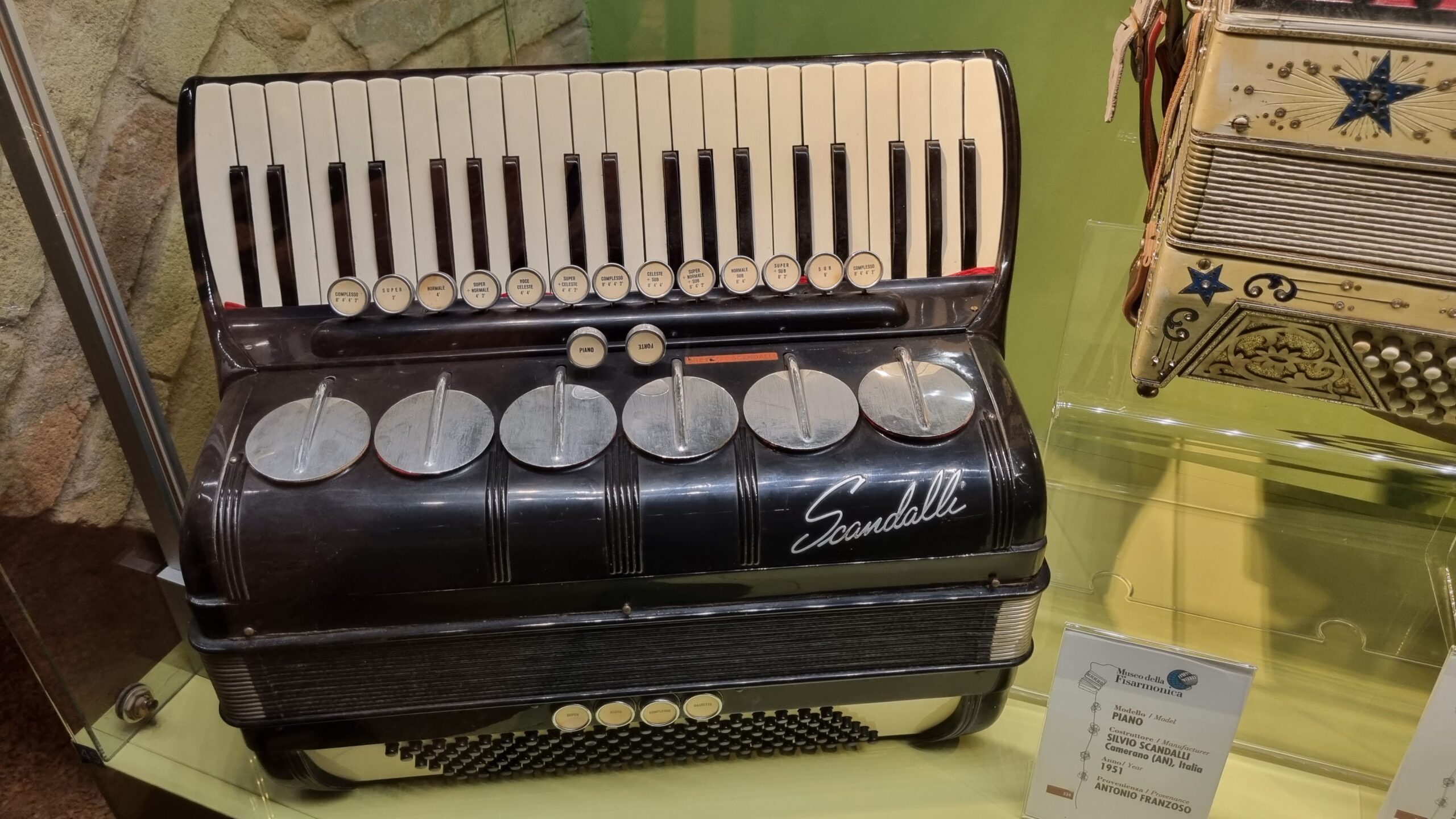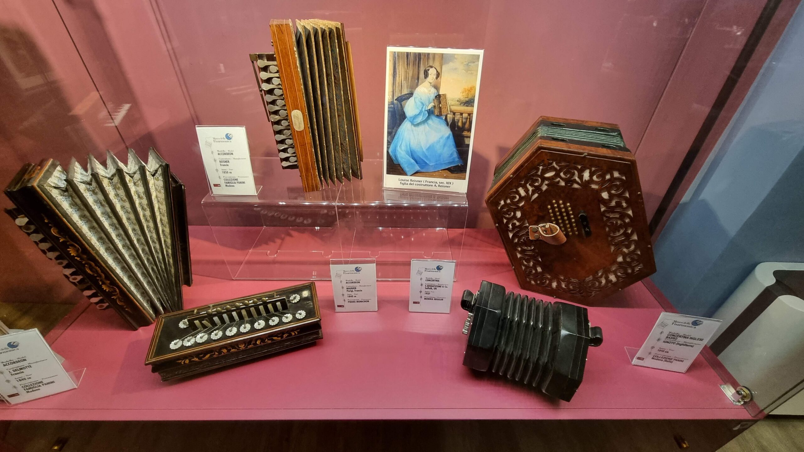 Nie brakuje też eksponatów wyjątkowych ze względu na konstrukcję – m.in. prototyp wykonany przez lutnika Mario Buonoconte na podstawie rysunku z Kodeksu Madryckiego II przypisywanego Leonardo da Vinci, czy akordeony Fisorchestra Frontalini, zaprojektowane tak, by imitować brzmienie orkiestry. W kolekcji znajdziemy również instrumenty używane w filmach, transparentny model firmy Brandoni wykonany z drewna i pleksi, odsłaniający mechanizmy wewnętrzne, a także egzemplarze z ogromnej kolekcji „króla naklejek” Giuseppe Paniniego.