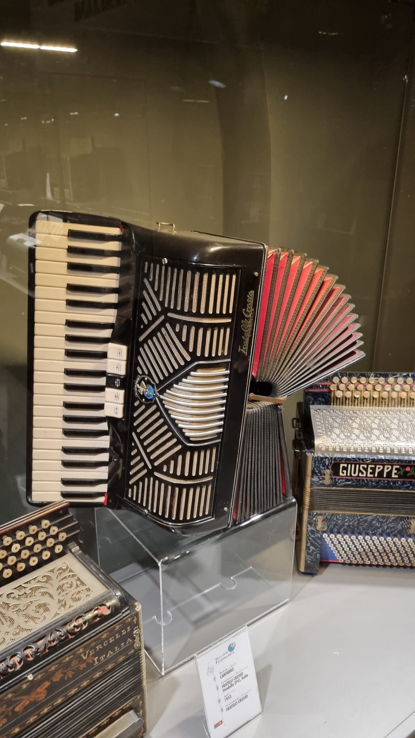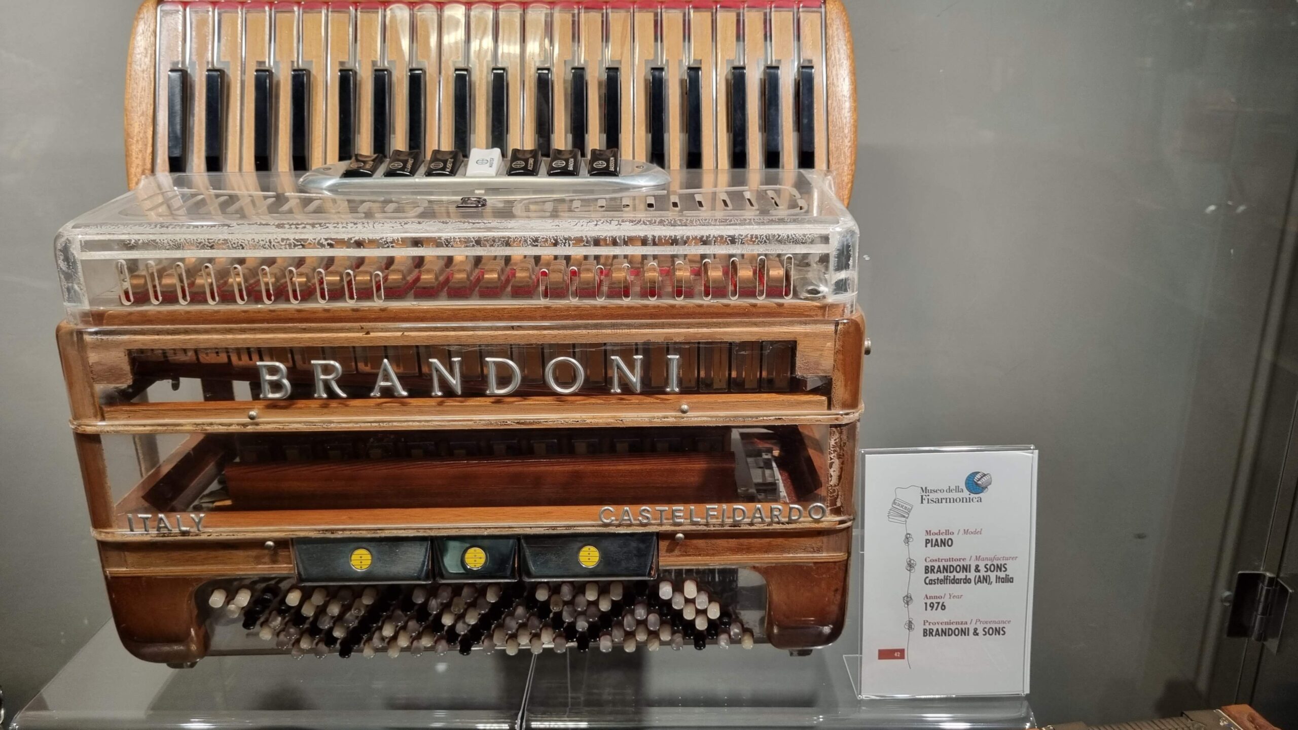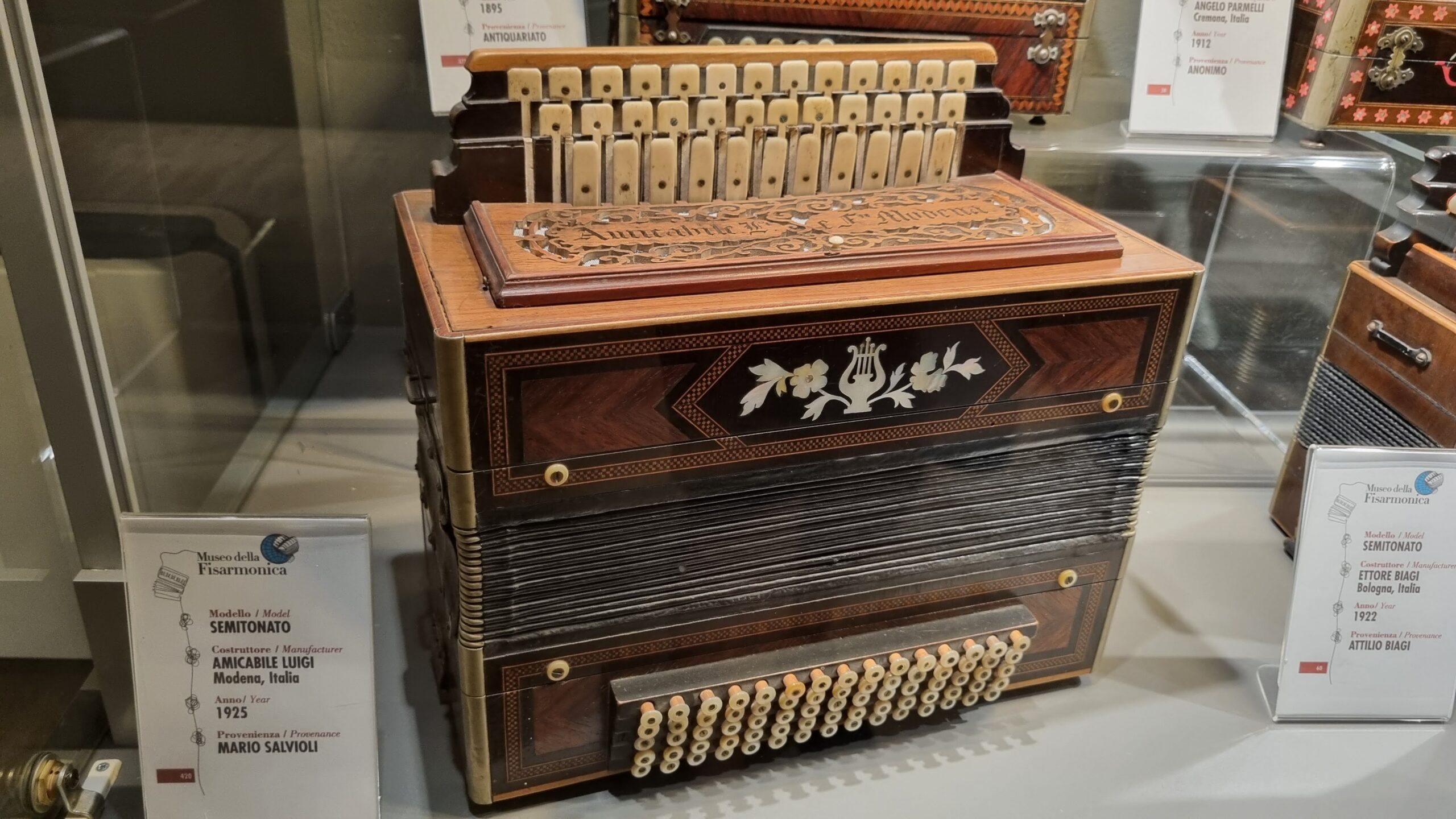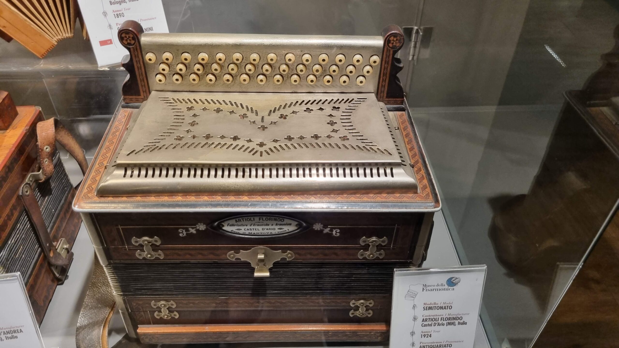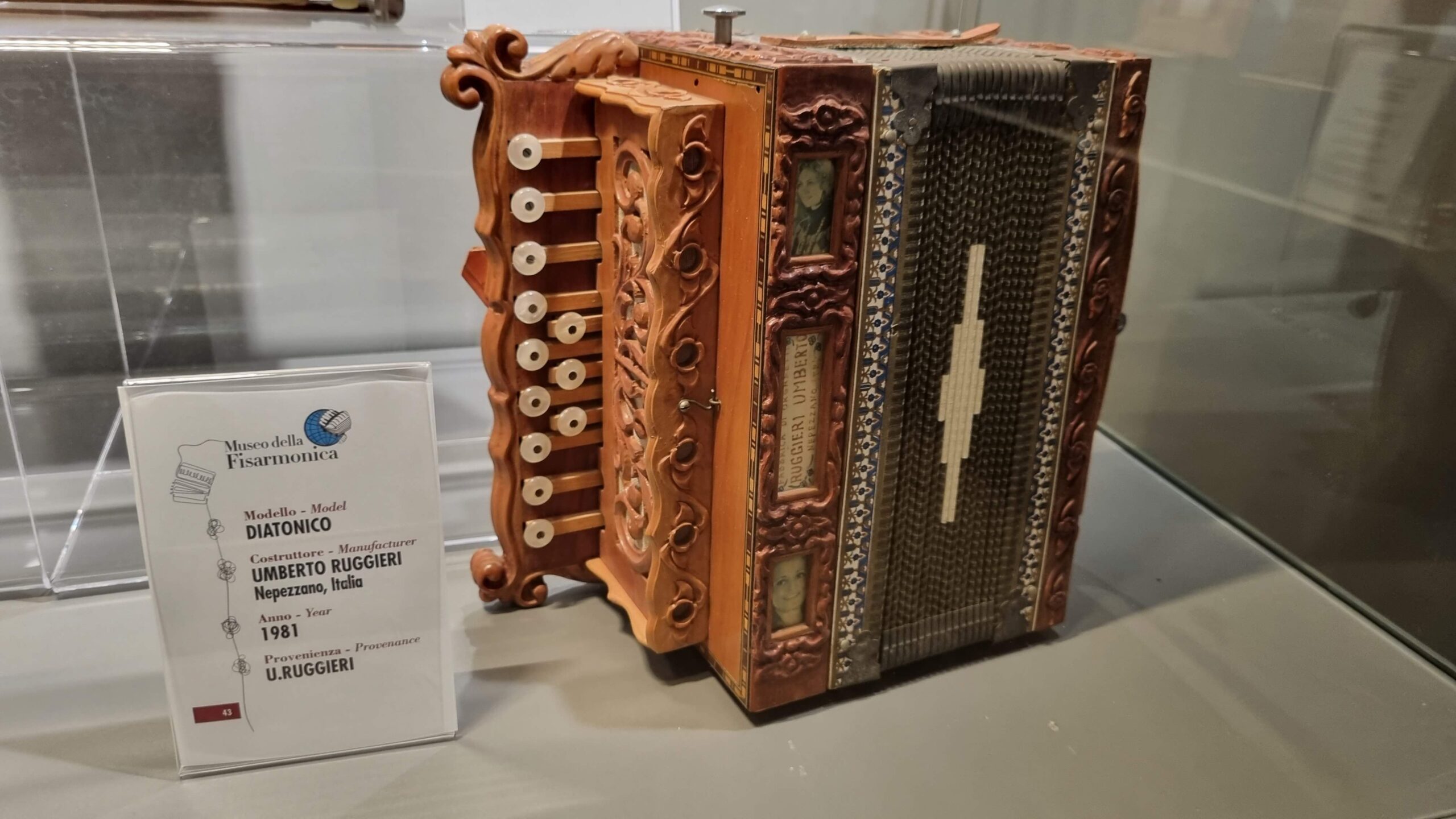 Nie brakuje też eksponatów wyjątkowych ze względu na konstrukcję – m.in. prototyp wykonany przez lutnika Mario Buonoconte na podstawie rysunku z Kodeksu Madryckiego II przypisywanego Leonardo da Vinci, czy akordeony Fisorchestra Frontalini, zaprojektowane tak, by imitować brzmienie orkiestry. W kolekcji znajdziemy również instrumenty używane w filmach, transparentny model firmy Brandoni wykonany z drewna i pleksi, odsłaniający mechanizmy wewnętrzne, a także egzemplarze z ogromnej kolekcji „króla naklejek” Giuseppe Paniniego.