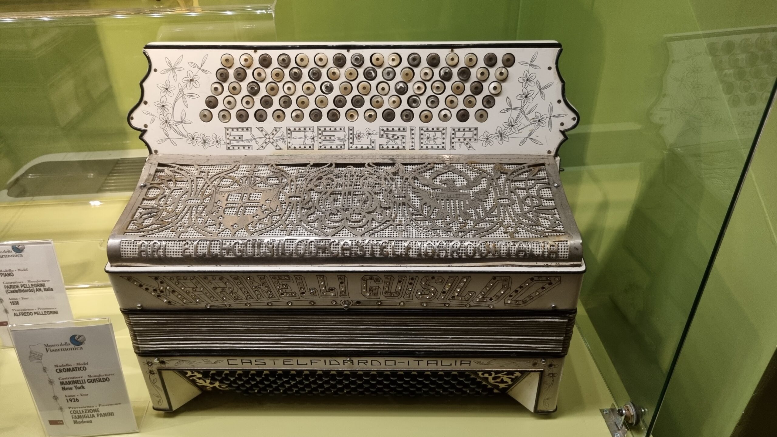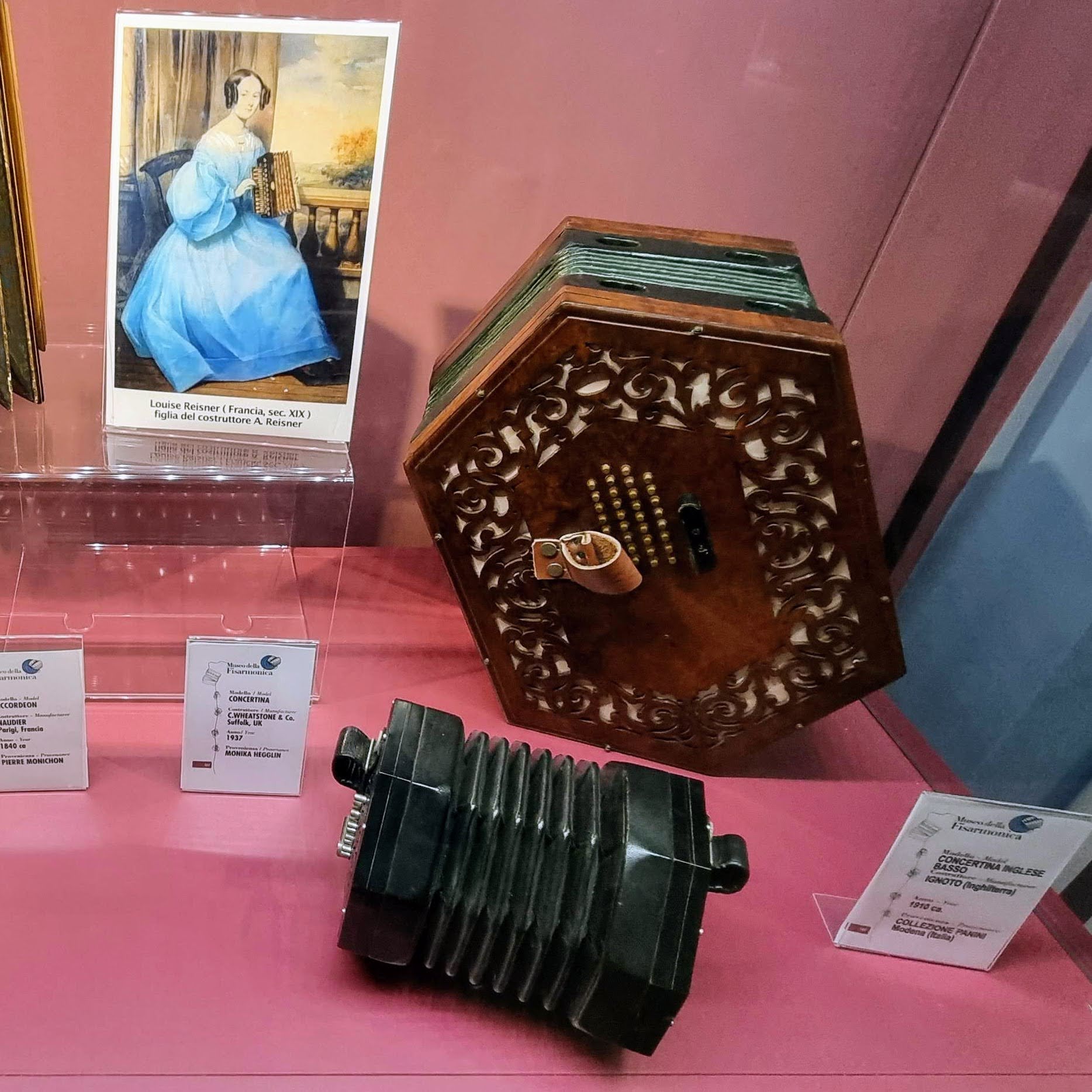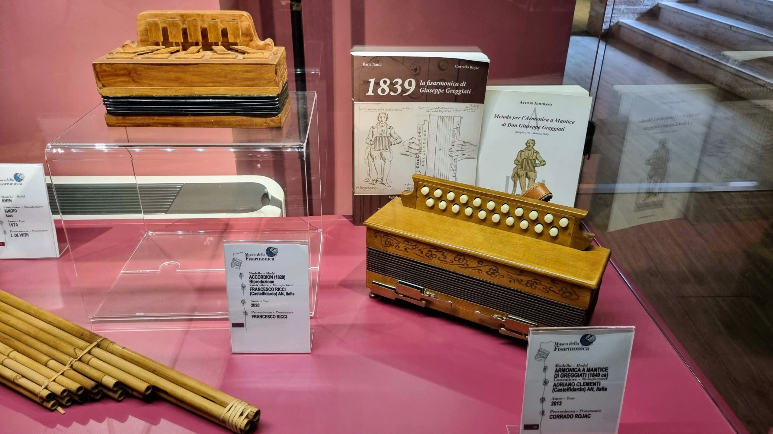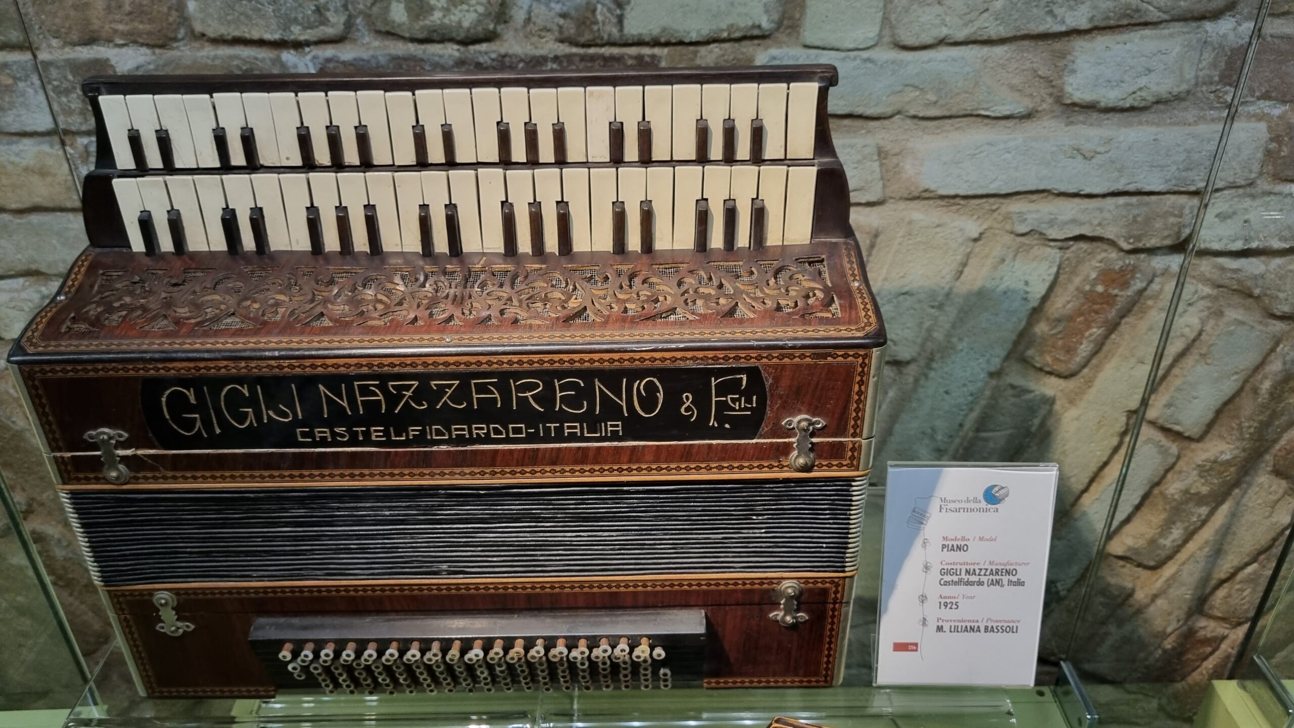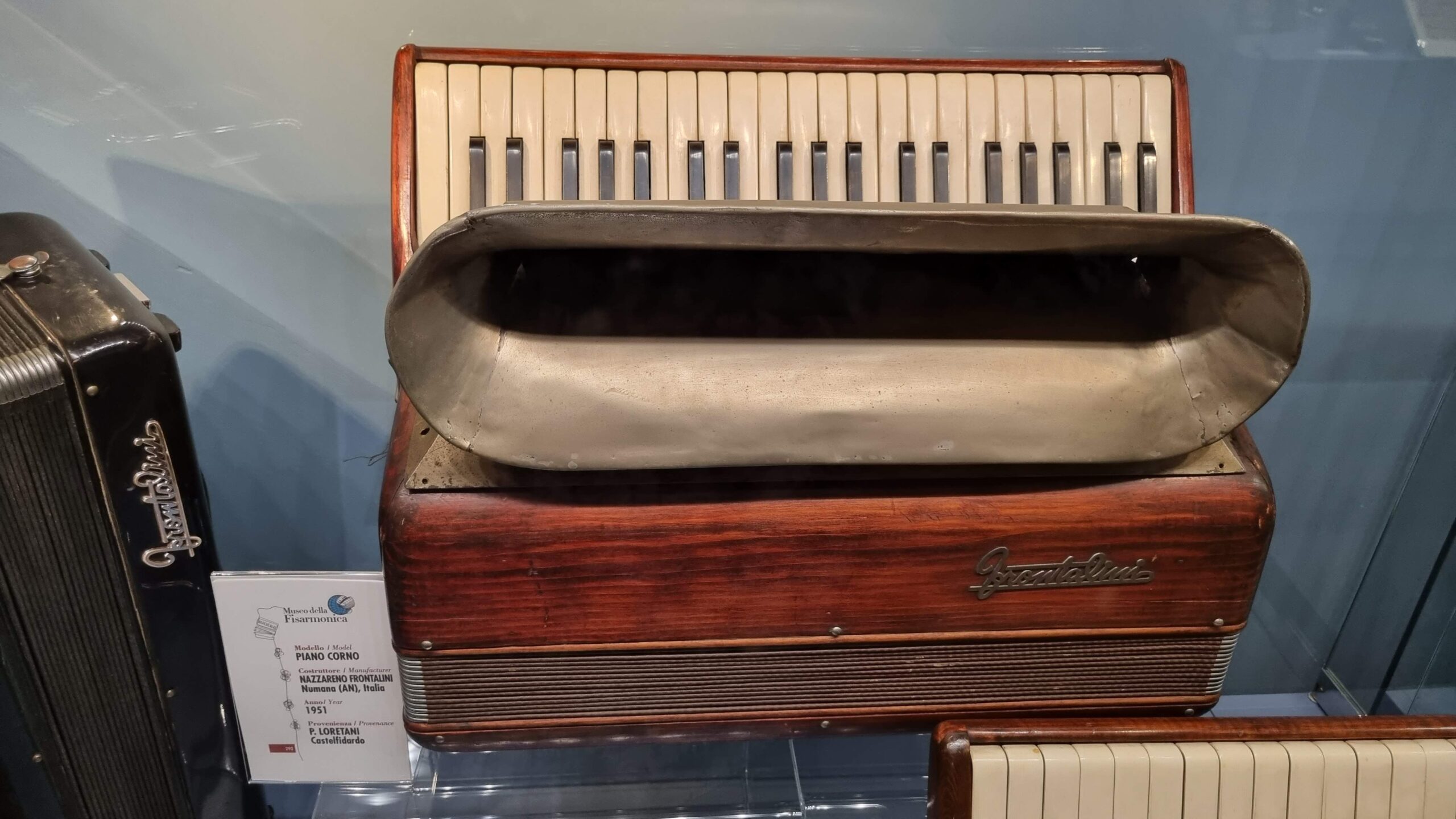 Nie brakuje też eksponatów wyjątkowych ze względu na konstrukcję – m.in. prototyp wykonany przez lutnika Mario Buonoconte na podstawie rysunku z Kodeksu Madryckiego II przypisywanego Leonardo da Vinci, czy akordeony Fisorchestra Frontalini, zaprojektowane tak, by imitować brzmienie orkiestry. W kolekcji znajdziemy również instrumenty używane w filmach, transparentny model firmy Brandoni wykonany z drewna i pleksi, odsłaniający mechanizmy wewnętrzne, a także egzemplarze z ogromnej kolekcji „króla naklejek” Giuseppe Paniniego.