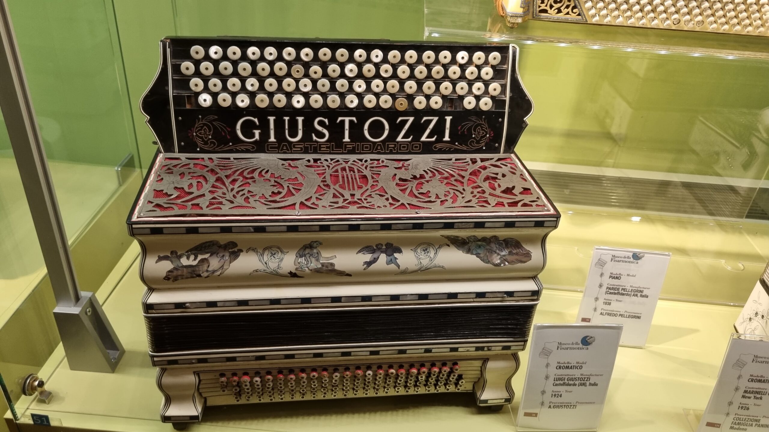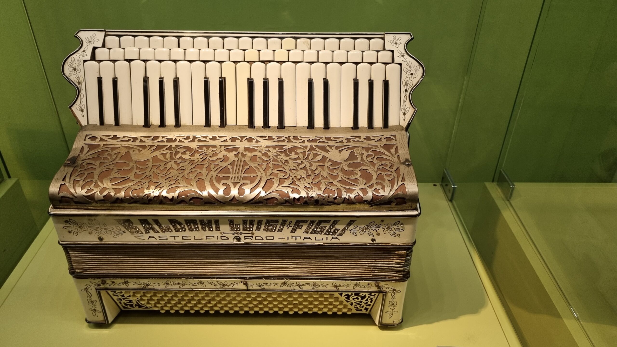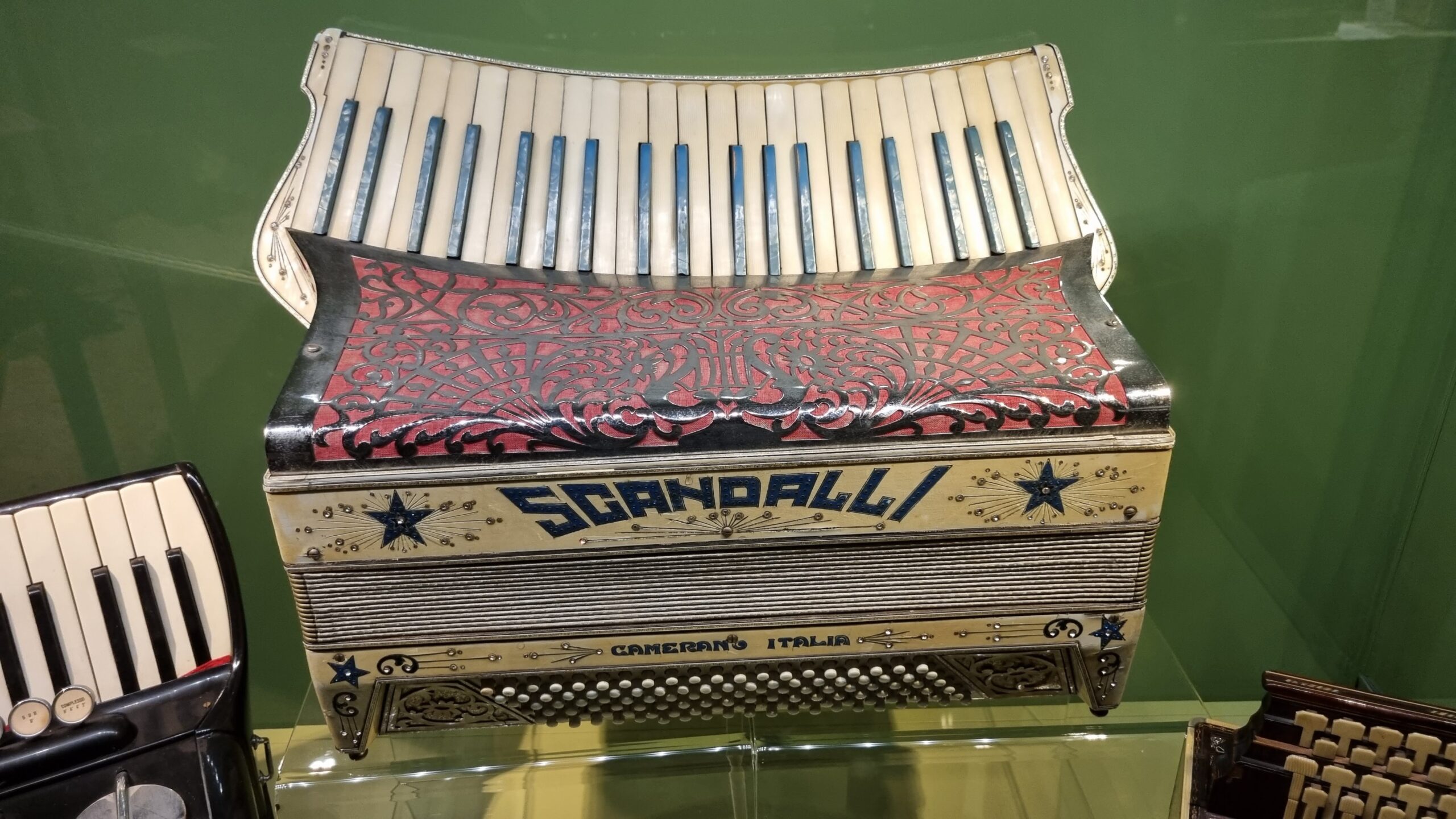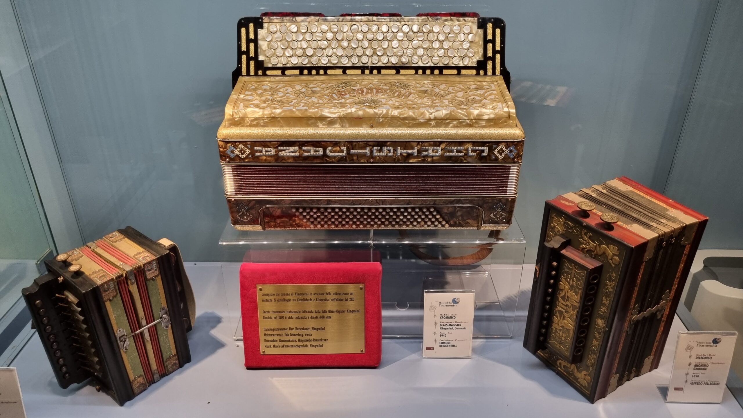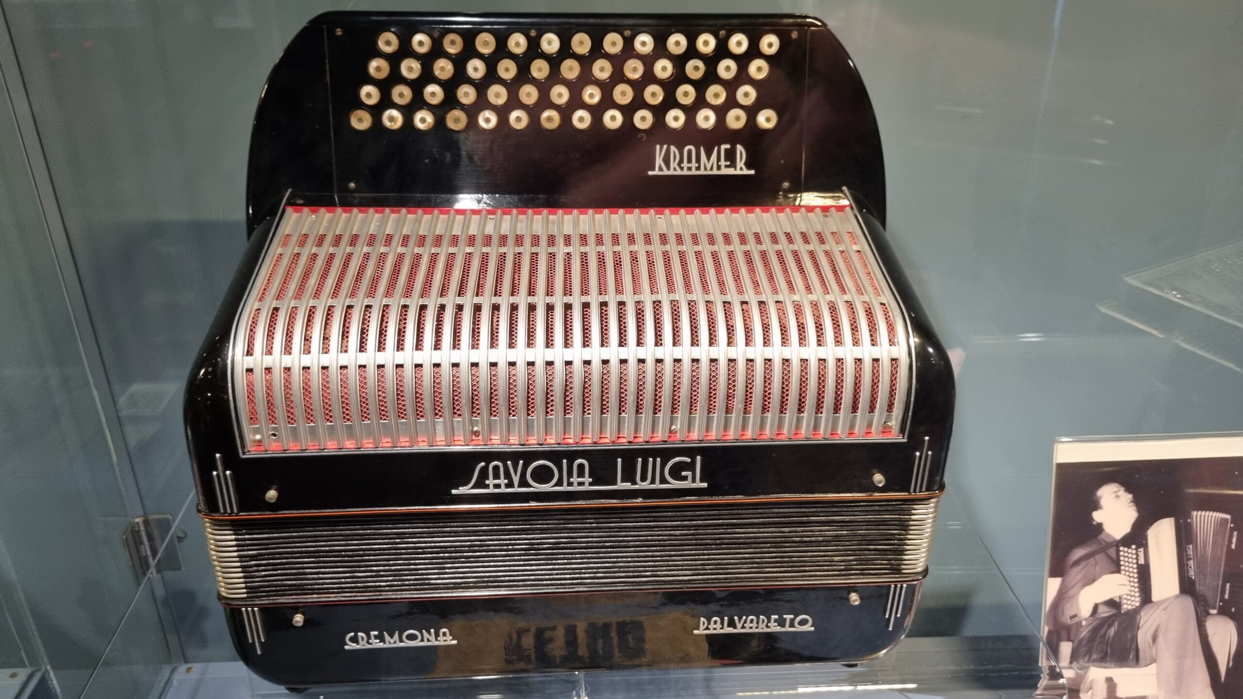 Nie brakuje też eksponatów wyjątkowych ze względu na konstrukcję – m.in. prototyp wykonany przez lutnika Mario Buonoconte na podstawie rysunku z Kodeksu Madryckiego II przypisywanego Leonardo da Vinci, czy akordeony Fisorchestra Frontalini, zaprojektowane tak, by imitować brzmienie orkiestry. W kolekcji znajdziemy również instrumenty używane w filmach, transparentny model firmy Brandoni wykonany z drewna i pleksi, odsłaniający mechanizmy wewnętrzne, a także egzemplarze z ogromnej kolekcji „króla naklejek” Giuseppe Paniniego.