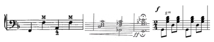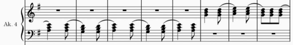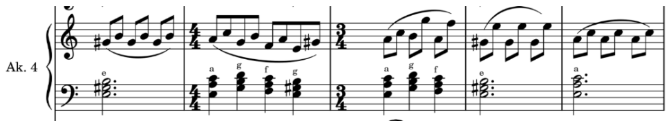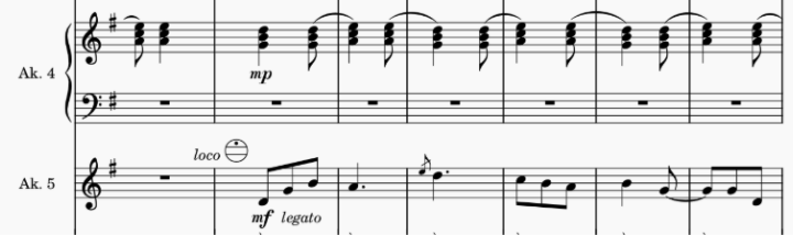 W ostatniej części suity najważniejszą zmianą w stosunku do oryginału jest podzielenie partii fortepianu na część melodyczną i akompaniament (ilustracja 11). Partie melodyczne oryginalnie zapisane na fortepian zostały przeniesione do innych głosów. Partii 4. akordeonu powierzono wyłącznie akompaniament akordowy (ilustracja 12).