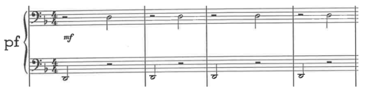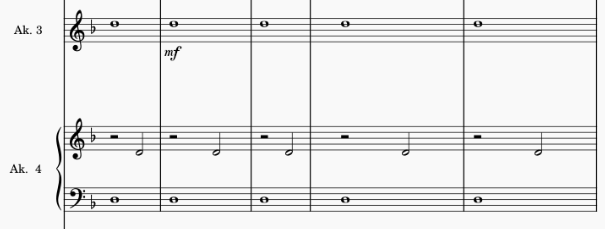 W taktach 21-25 oraz 30 zdecydowałem się na pominięcie akordów w manuale basowym 4. partii z uwagi na trudną do przełożenia na system gotowych akordów harmonię. Ma to także wyraz artystyczny – chwila “oddechu” przygotowująca do punktu kulminacyjnego.
