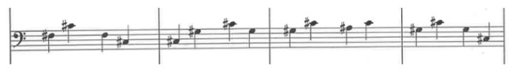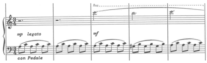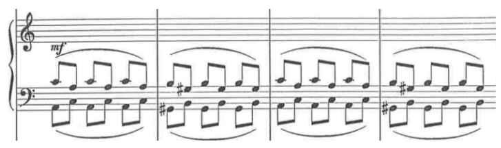 Największym problemem w tej części suity jest imitowanie przez akordeony aury harmonicznej, którą wyzwala użycie prawego pedału na fortepianie (ilustracja 4). Zdecydowałem się rozwiązać ten problem dwojako. Po pierwsze podzieliłem partię fortepianu pomiędzy akordeon czwarty i piąty tak, by żadna z tych partii nie była nadmiernie skomplikowana. Dzięki temu możliwe było przeniesienie partii granej w oryginale lewą ręką do manuału dyszkantowego. Po drugie, celem uzyskania warstwy harmonicznej, wykorzystałem manuał akordowy – wykonawca 4. partii gra lewą ręką akordy odpowiadające harmonii utworu. Melodia 4. głosu wykonywana prawą ręką została przeniesiona do 3. partii (ilustracja 5).
