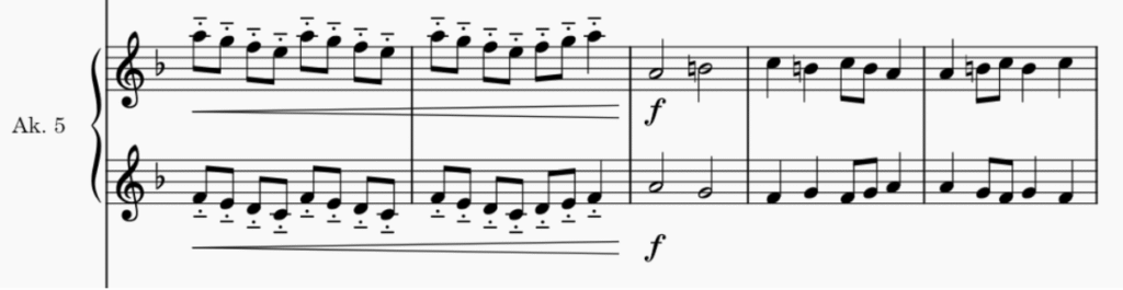 - W oryginalnym wydaniu wkradł się mały błąd – pierwsza partia ma zapisane metrum 3/4, jednak notacja muzyczna oraz metrum w partiach innych instrumentów nie pozostawiają wątpliwości. ↩︎