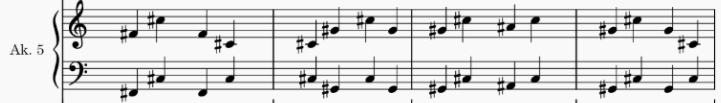 - Zapisanie wszystkich składników akordu w konkretnym przewrocie rodzi mały problem – zależności od rodzaju akordeonu występują różne przewroty akordów, ma to związek z budową instrumentu i zastosowaniem różnych skal. Najczęściej występuje skala e-dis1, do której się stosowałem. ↩︎