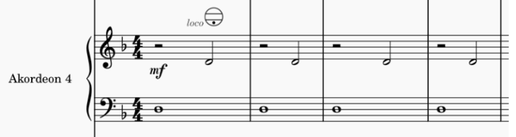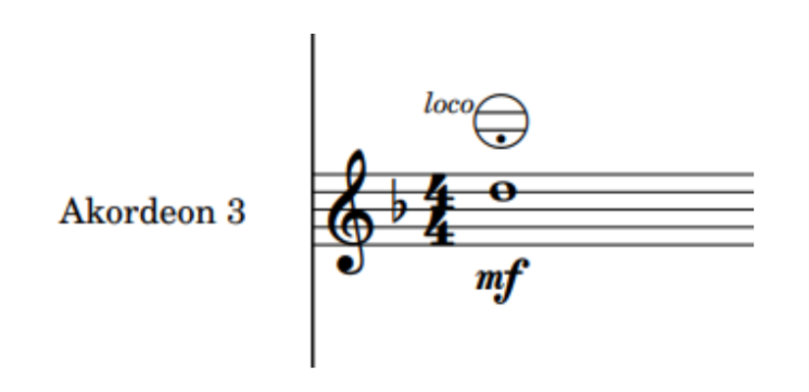 Partia 3. akordeonu została przepisana w kluczu wiolinowym (w oryginale jest w kluczu basowym). Należy więc zastosować regestr transponujący w dół, by oddać niższe brzmienie. W 9. takcie partia 3. akordeonu dubluje jeden z głosów dzwonków sztabkowych. Wykonawca musi wtedy przełączyć regestr na taki, który transponuje w górę. W celu ułatwienia tej czynności, dwa wcześniejsze takty są puste. W 13. takcie następuje powrót do regestru transponującego w dół.