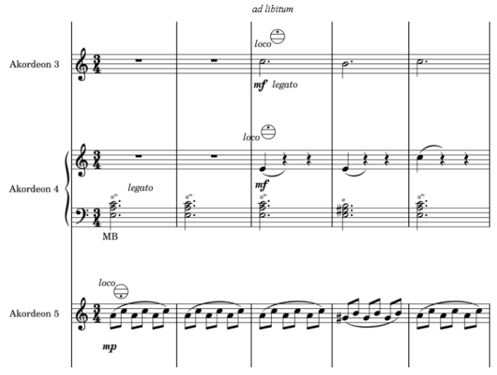 Partia 3. akordeonu głównie imituje nisko brzmiący instrument melodyczny. Partia zapisana jest w kluczu wiolinowym, należy użyć regestra transponującego. W takcie 58 i 59 należy pamiętać o przełączeniu regestra, gdyż w tym miejscu wykonywana jest partia fortepianu.