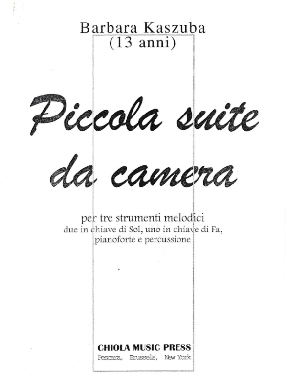 Nader ciekawie prezentują się kulisy powstania utworu “Piccola suite da camera”. Utwór napisany na 3 instrumenty melodyczne, fortepian i instrumentarium Orffa powstał w 1996 roku (kompozytorka miała wówczas 13 lat) na zamówienie wybitnego polskiego kompozytora, pianisty i pedagoga Piotra Lacherta13. W zamówieniu były bardzo konkretnie sformułowane cele pedagogiczne: miał być to utwór możliwy do wykonania przez dzieci ze szkoły podstawowej, który skłoni ich do wspólnego muzykowania. Utwór na 3 dowolne instrumenty melodyczne – dwa z nich o wyższej skali, zapisane w kluczu G (np. skrzypce, flet); jeden niższy, zapisany w kluczu F (np. wiolonczela), fortepian oraz instrumentarium Orffa, czyli proste instrumenty perkusyjne: dzwonki melodyczne (potocznie cymbałki), trójkąt, tamburyn, dzwoneczki, stanowiące wyposażenie sal rytmicznych wszystkich szkół muzycznych. Stopień trudności utworu miał nie przekraczać poziomu umiejętności dzieci, które rozpoczynają naukę gry na instrumencie. Mimo dużego wyzwania, bardzo konkretna specyfikacja sprawiła, że Barbara Kaszuba napisała utwór w około 2 miesiące14. Kompozycja doczekała się wykonania i przede wszystkim wydania we włoskim wydawnictwie Chiola Music Press (ilustracja 1).